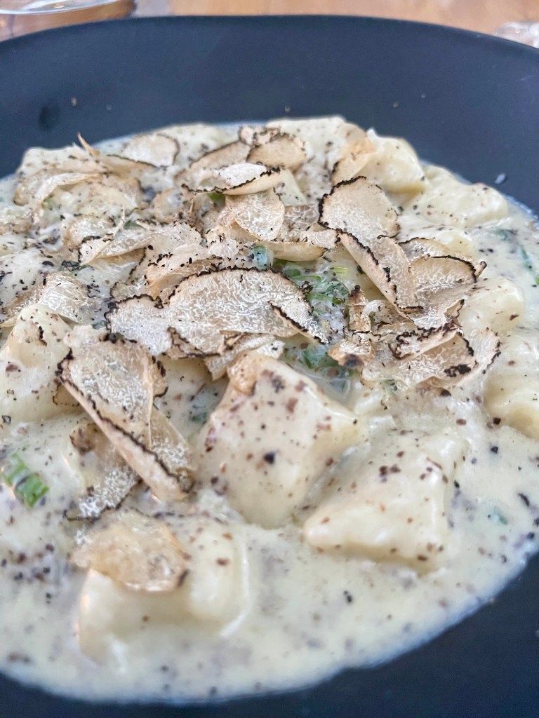 Chris enjoyed the beautifully presented dish of braised short ribs. The tender meat was rich and flavorful, served with a creamy eggplant puree, roasted tomatoes, and a light yogurt sauce. The combination of textures and flavors was a true delight, showcasing the best of Greek cuisine with a modern twist. Jennifer enjoyed gnocchi with a delightful cream sauce and ample Greek truffle.