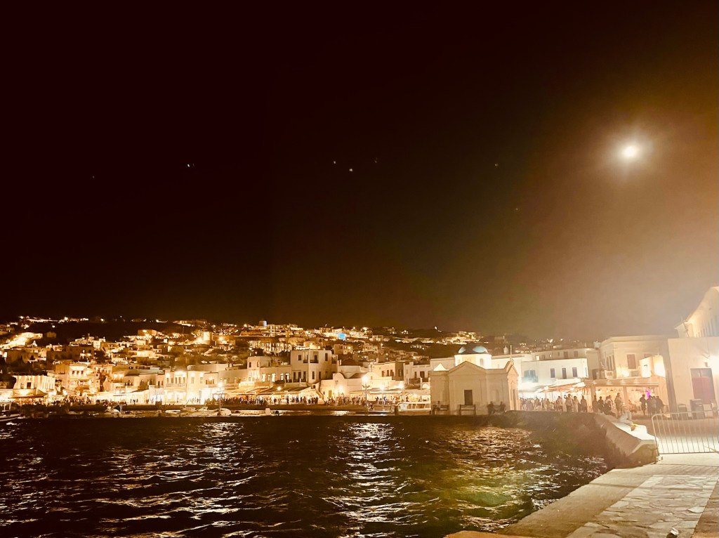As the day turned to evening, we returned to the ship for a quick refresh before heading back to Chora to experience Mykonos by night. It was our first time seeing the town at night and boy the town changed dramatically under the moonlight, with the streets filling up with people ready to enjoy the island’s famous nightlife. We wandered the streets, eventually settling in at our chosen spot for dinner.